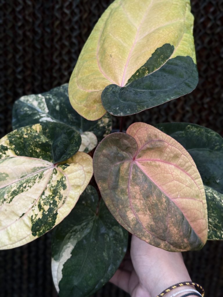 A rare variegated specimen derived from a green-to-green cross of Anthurium DocBlock × Red Vein Dark Phoenix.